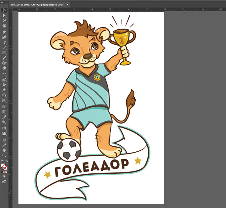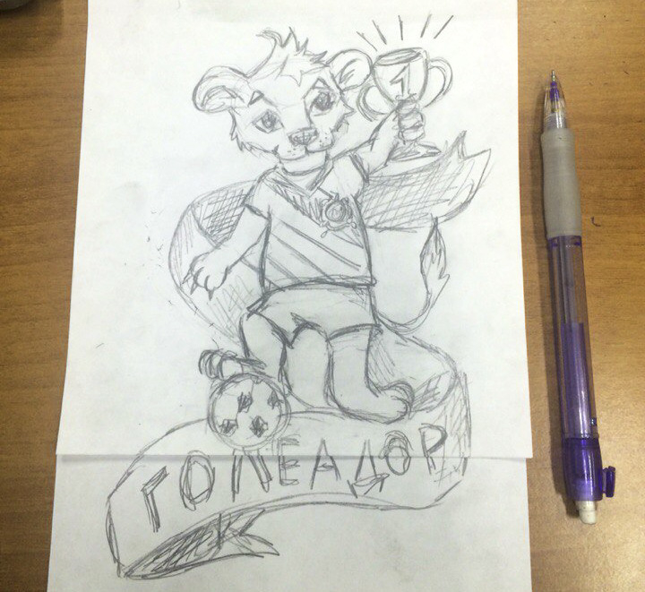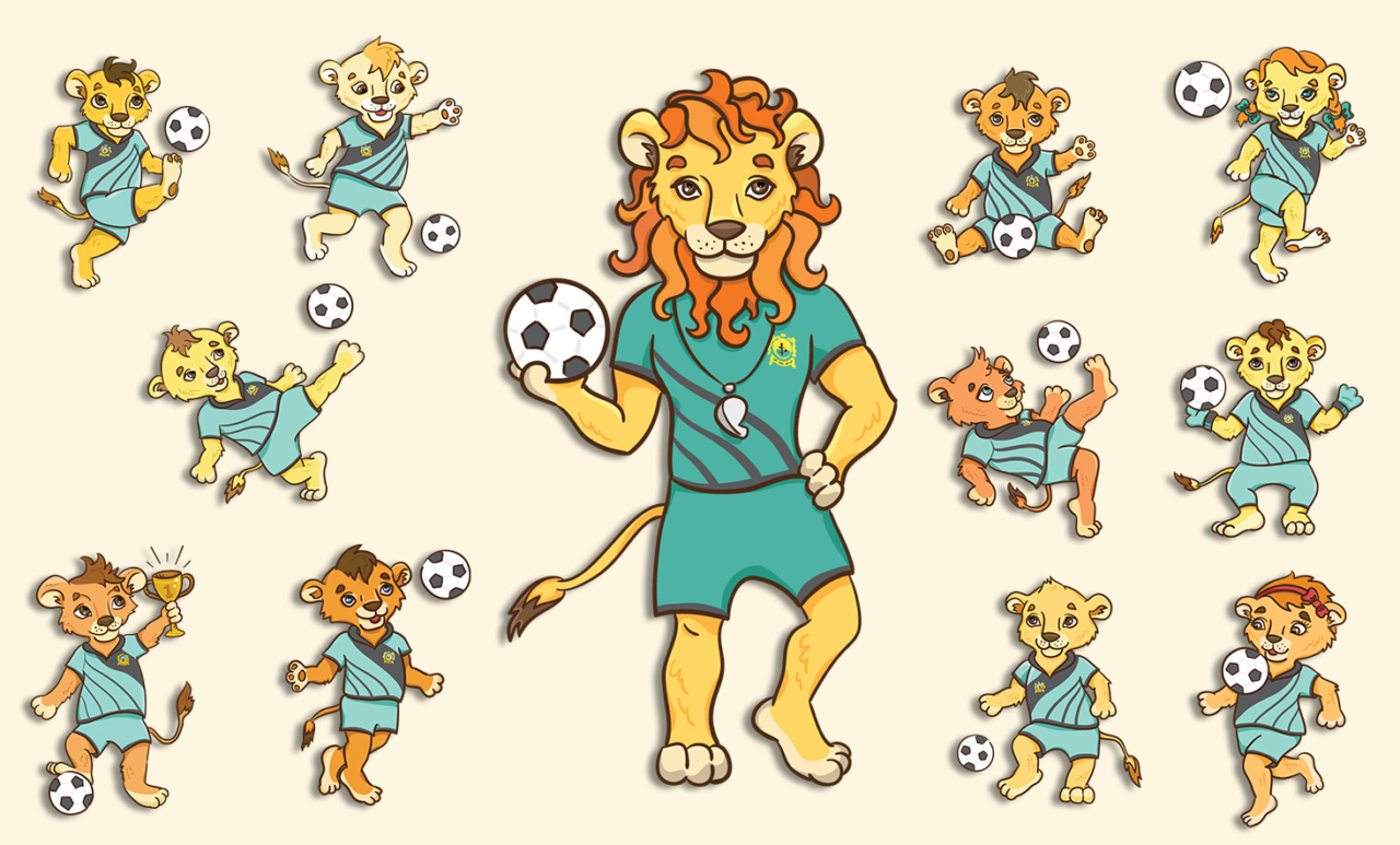 Первый образ, который приходит в голову, когда думаешь о львенке - Симба. Но наш Симба не просто царь зверей, он еще и лучший футболист. Поэтому мы одели львенка в форму школы, вручили ему кубок и бросили к его ногам шарф болельщика.